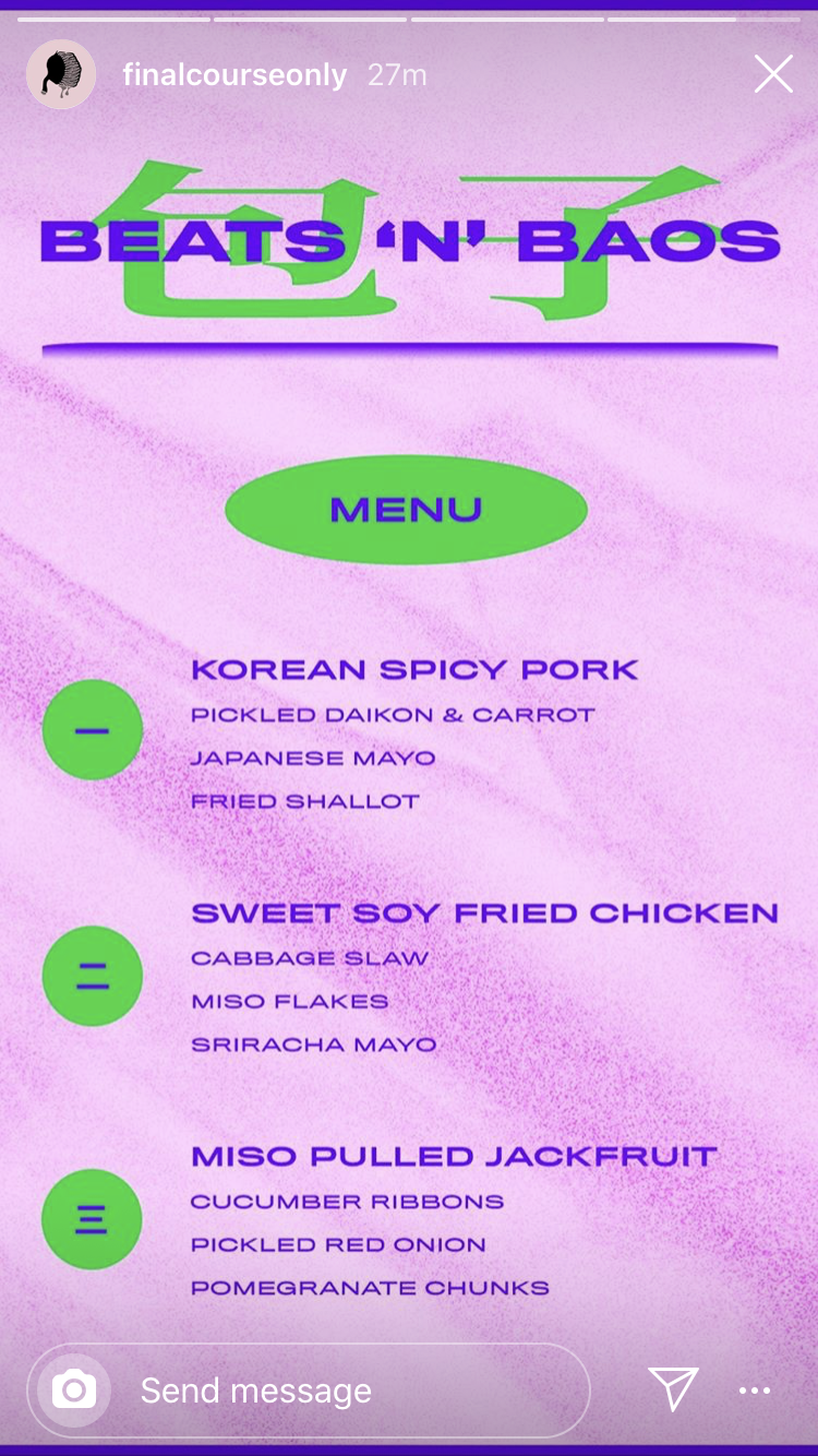 “Final Course Only was a personal project that I decided to pursue this year after returning from my year long internship at Stanford University. Final Course Only was an outlet for me to collaborate with different creatives both in and out of culinary arts in the form of community events” - June Kim